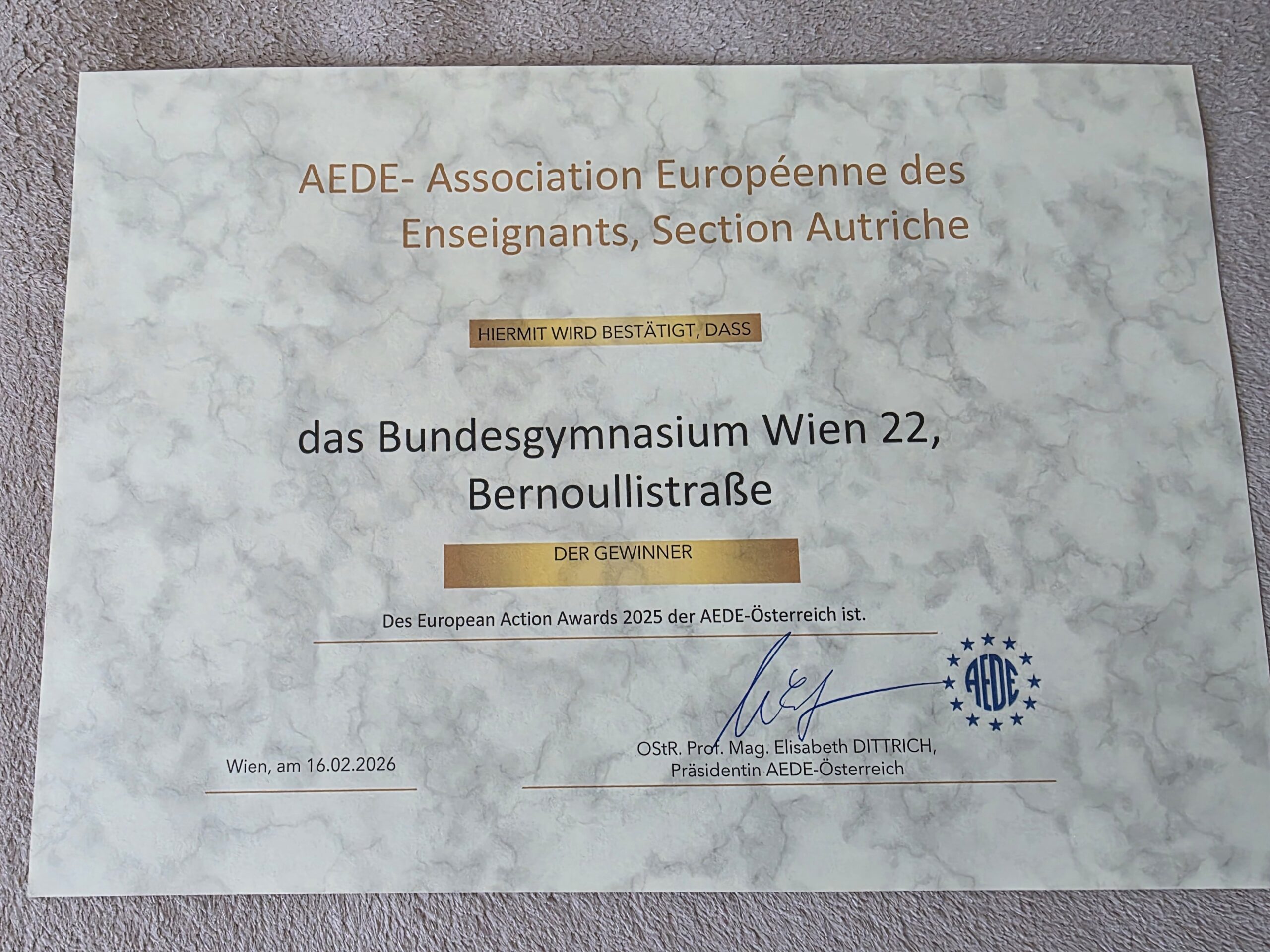 Herzlichen Glückwunsch zum Gewinn des „European Action Awards 2025“ ( Zertifikat und Geldpreis) der AEDE-Österreich an das BG 22, Bernoullistraße, in der Donaustadt!